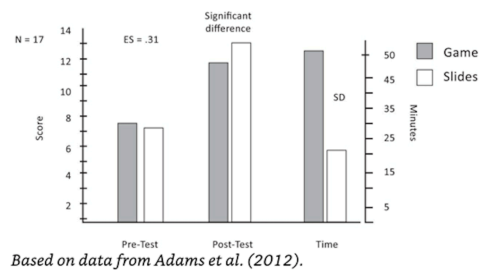 As you can see, a highly engaging lesson in the form of a thematic game not only took longer to complete but also led to slightly less learning than a slide show that presented the same content.